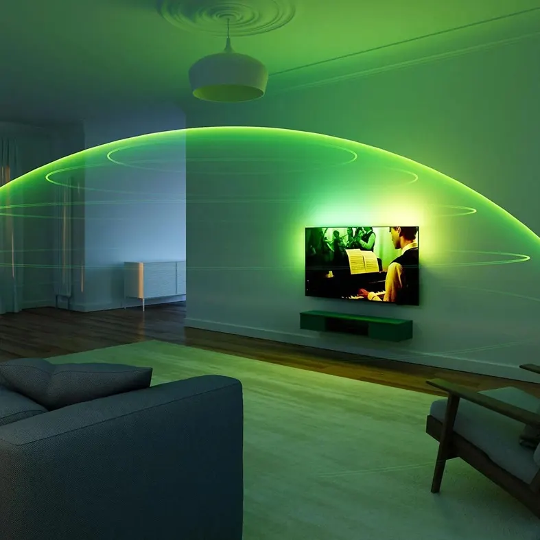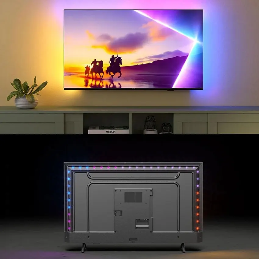 Kleurrijke lichteffecten worden op de muur achter de tv geprojecteerd en passen zich in realtime aan
